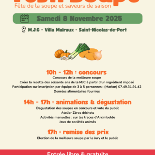 Les jeunes de la MJC organisent le Festi’soupe le samedi 8 novembre. Il s’agit d’un concours culinaire convivial où des équipes réalisent des soupes originales à partir de paniers garnis de produits locaux, ensuite proposées à la...