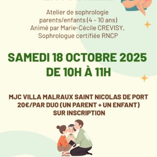 La MJC organise un atelier de sophrologie parent/enfant samedi 18 octobre prochain, de 10h à 11h. « Vivre ses émotions sereinement en famille »: le thème proposé par Marie-Cécile CREVISY, sophrologue certifiée, permettra à petits et...